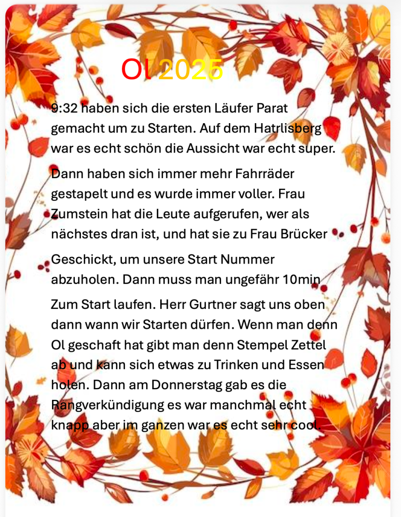 Es sind jetzt schon wieder 3 Wochen seit den Herbstferien vergangen und wir haben schon sehr viel erlebt. Wir hatten schon die ersten Präsentationen und Tests. Wir hatten auch schon den OL und haben im Sport dafür geübt. Wir gehen am Dienstag mit der 7e Burger, die von der Landschulwoche übrig geblieben sind an die Zulg essen. Wir hatten auch schon sehr viele lustige Momente und sehr viel gelacht.Wir haben auch schon Sachen geplant, wo wir uns sehr drauf freuen. Wir haben glaube ich 3-mal den Platz getauscht und einmal durften wir wählen.